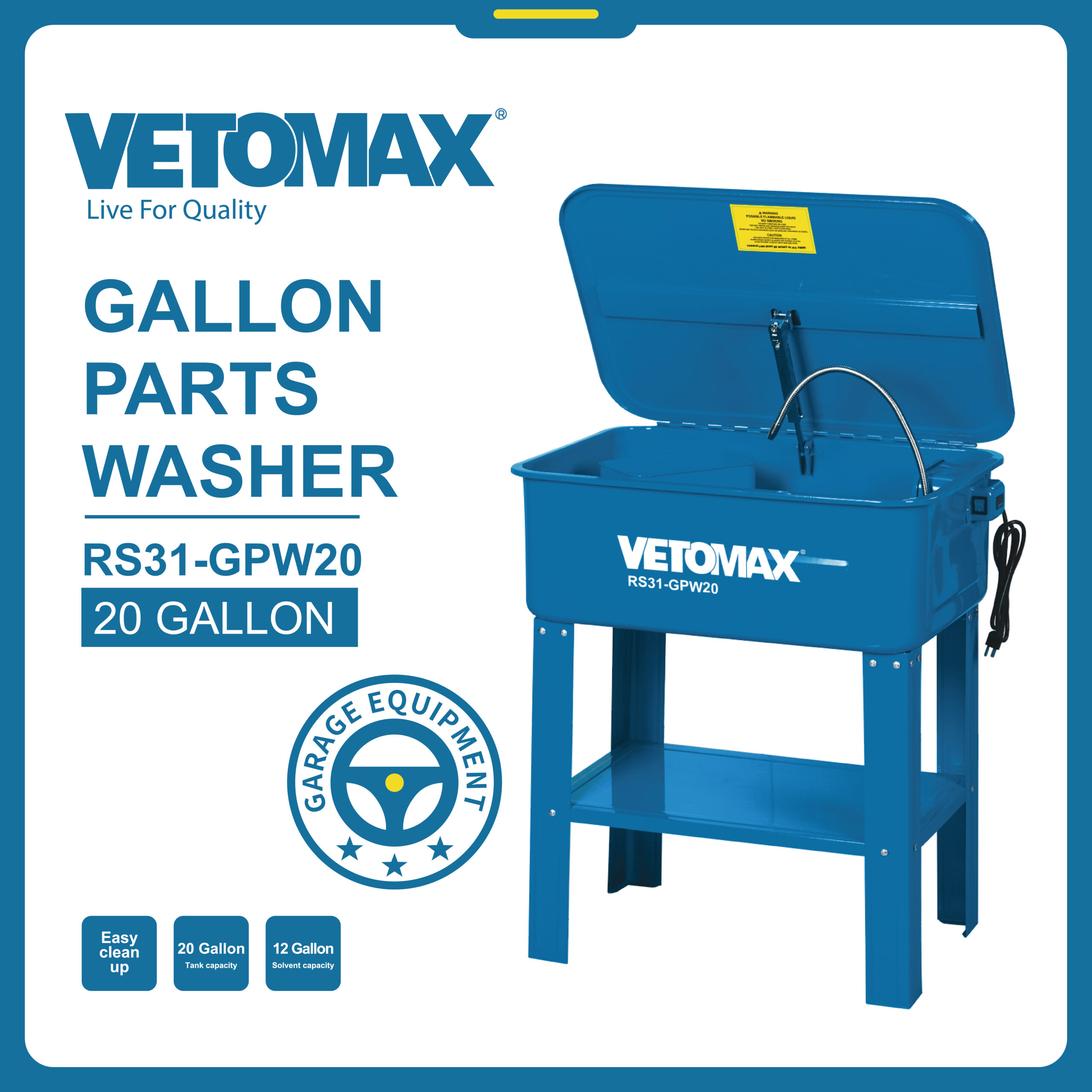 GALLON PARTS WASHER Max pump output through spigot: recirculates 2.7-3.3litre/min of solvent Max Head: 1.95m-2m Electric requirement: 220V-240V,50Hz Tank capatity:20 Gallon Solvent capaticy:12 Gallon Overall size: 76x54x88cm Carton packing