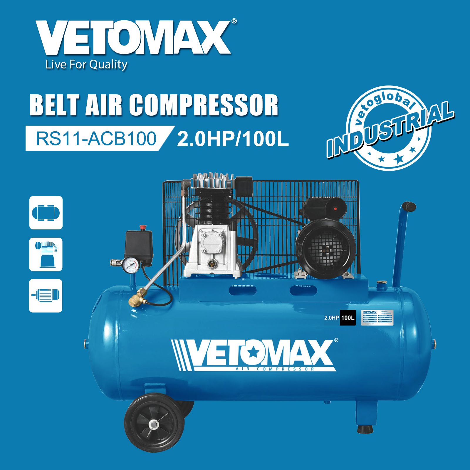 BELT AIR COMPRESSOR POWER(W/HP)- 2.0 HP CYLINDER- 2055 SPEED(R.PM)- 1050 PRESSURE(BAR/PSI)- 8/115 CAPACITY(L/M)- 170/6 TANK(L)-100L MOTOR -220V/50HZ DIM: 99*38*76CM