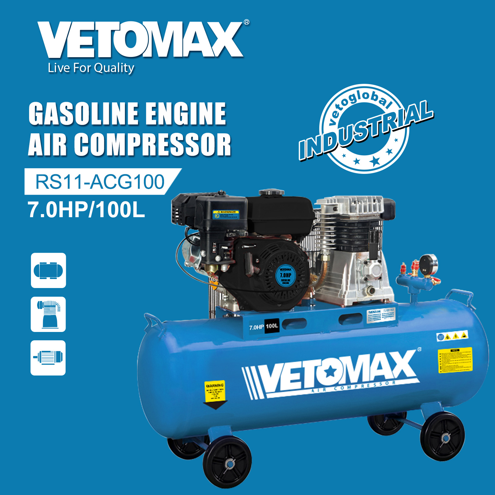 GASOLINE ENGINE AIR COMPRESSOR POWER(W/HP)- 7.0HP POWER(W/HP)- 7.0HP CYLINDER-2065 SPEED(R.PM)- 1050 PRESSURE(BAR/PSI)- 8/115 PRESSURE(BAR/PSI)- 8/115 CAPACITY(L/M)- 170/6 TANK(L)-100L DIM: 80*37*69CM