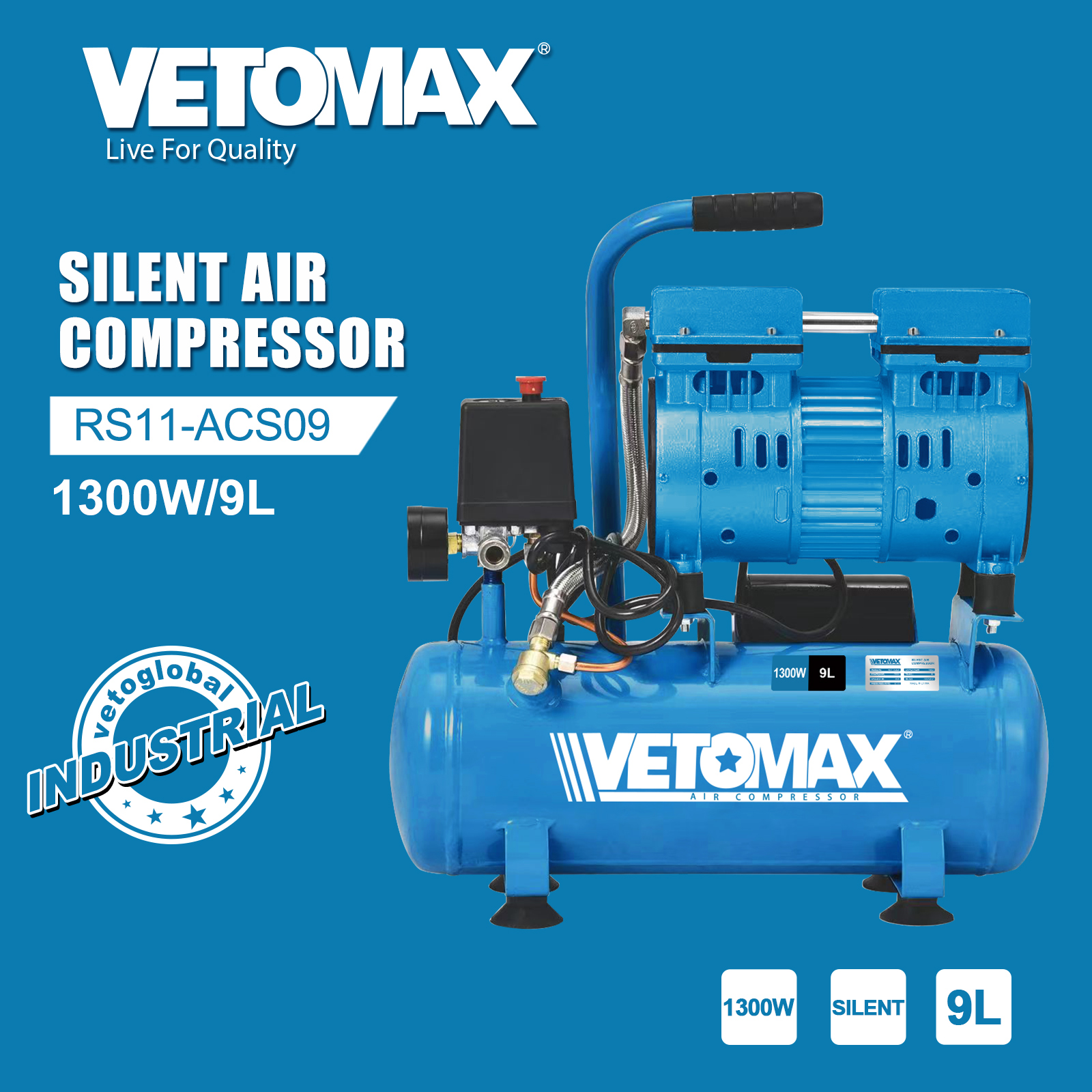 SILENT AIR COMPRESSOR POWER(W/HP)- 1300W SPEED(R.P.M)- 2800 PRESSURE(BAR/PSI)- 8/115 CAPACITY(L/M)- 150/3 TANK(L)- 9L MOTOR -220V/50HZ DIM:50*20*48CM