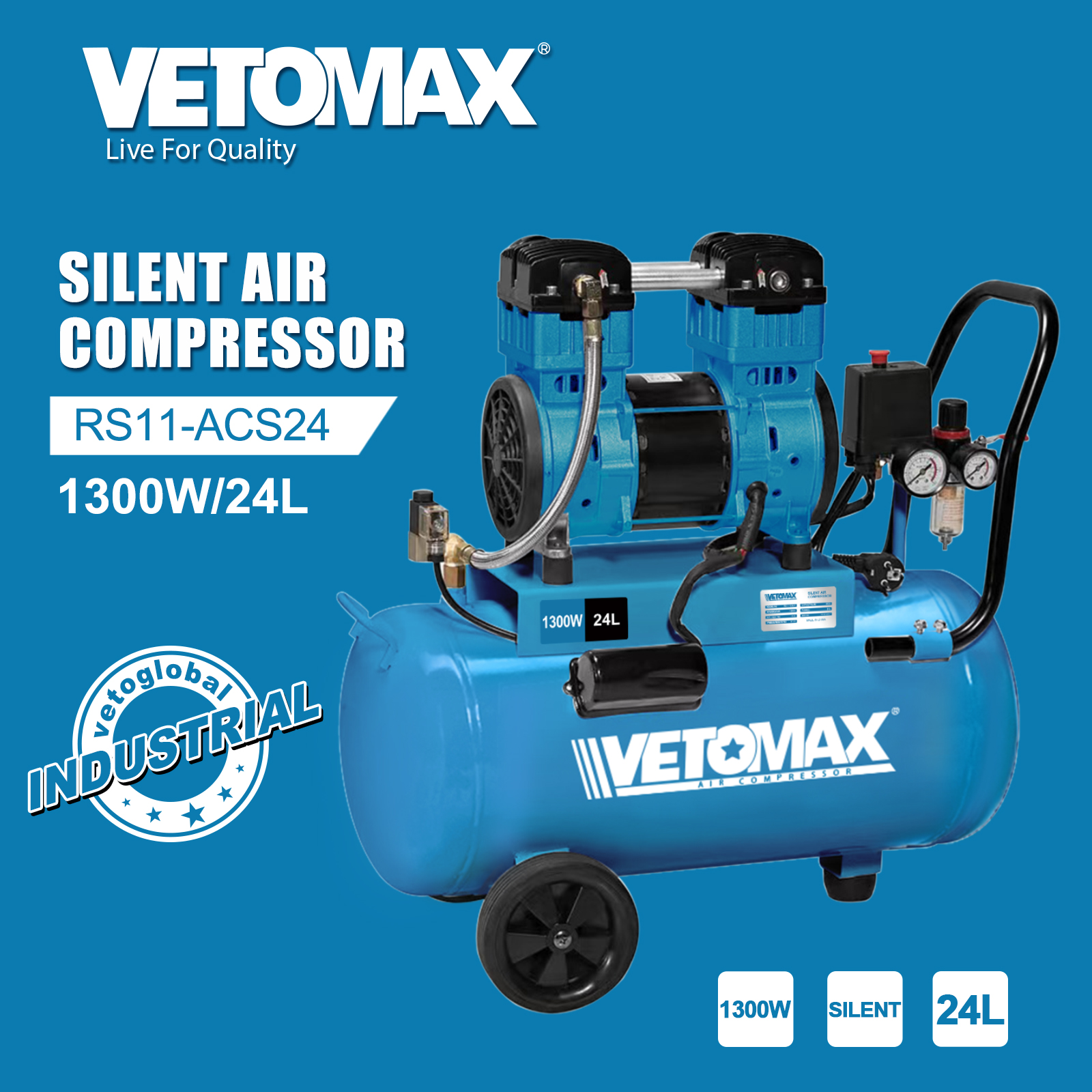 SILENT AIR COMPRESSOR POWER(W/HP)- 1300W SPEED(R.PM)- 2800 PRESSURE(BAR/PSI)- 8/115 CAPACITY(L/M)- 150/3 TANK(L)-24L MOTOR -220V/50HZ DIM:54*24*52CM