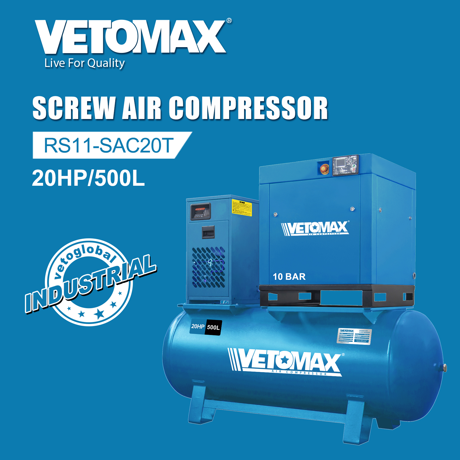 SCREW AIR COMPRESSOR Motor power (HP) : 20HP Type: Screw TANK (L) : 500L Working Pressure(BAR ) : 10BAR Voltage :380V/50HZ Power Source: AC POWER Air capacity:2m³ /min With Inverter Permanent magnet variable frequency With Inverter