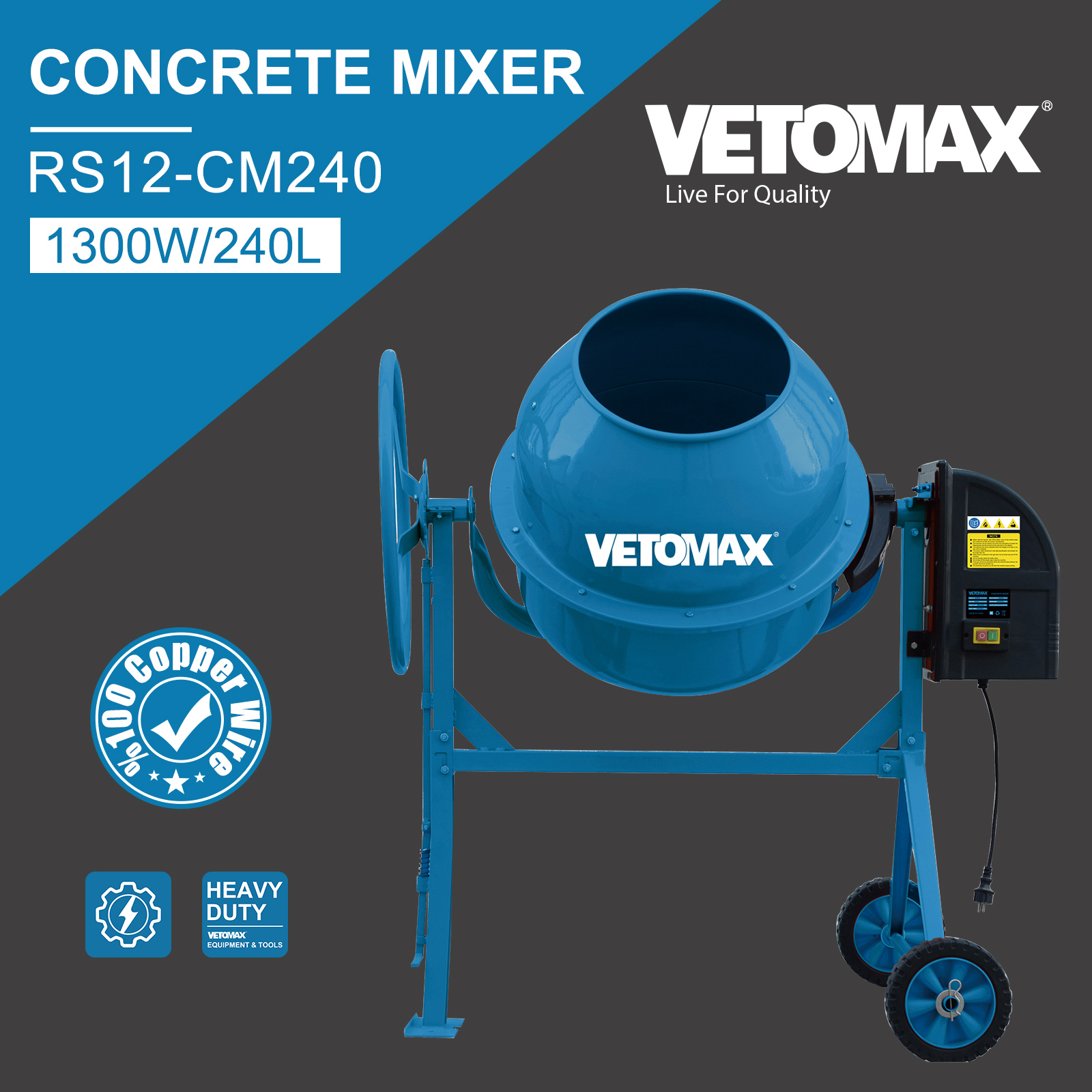 CONCRETE MIXER Voltage: 220-240V/50HZ Drum Volume: 240L Input power: 1300W Drum Diameter : 655mm Drum height : 760mm Copper wire induction motor DIM:126*85*142CM
