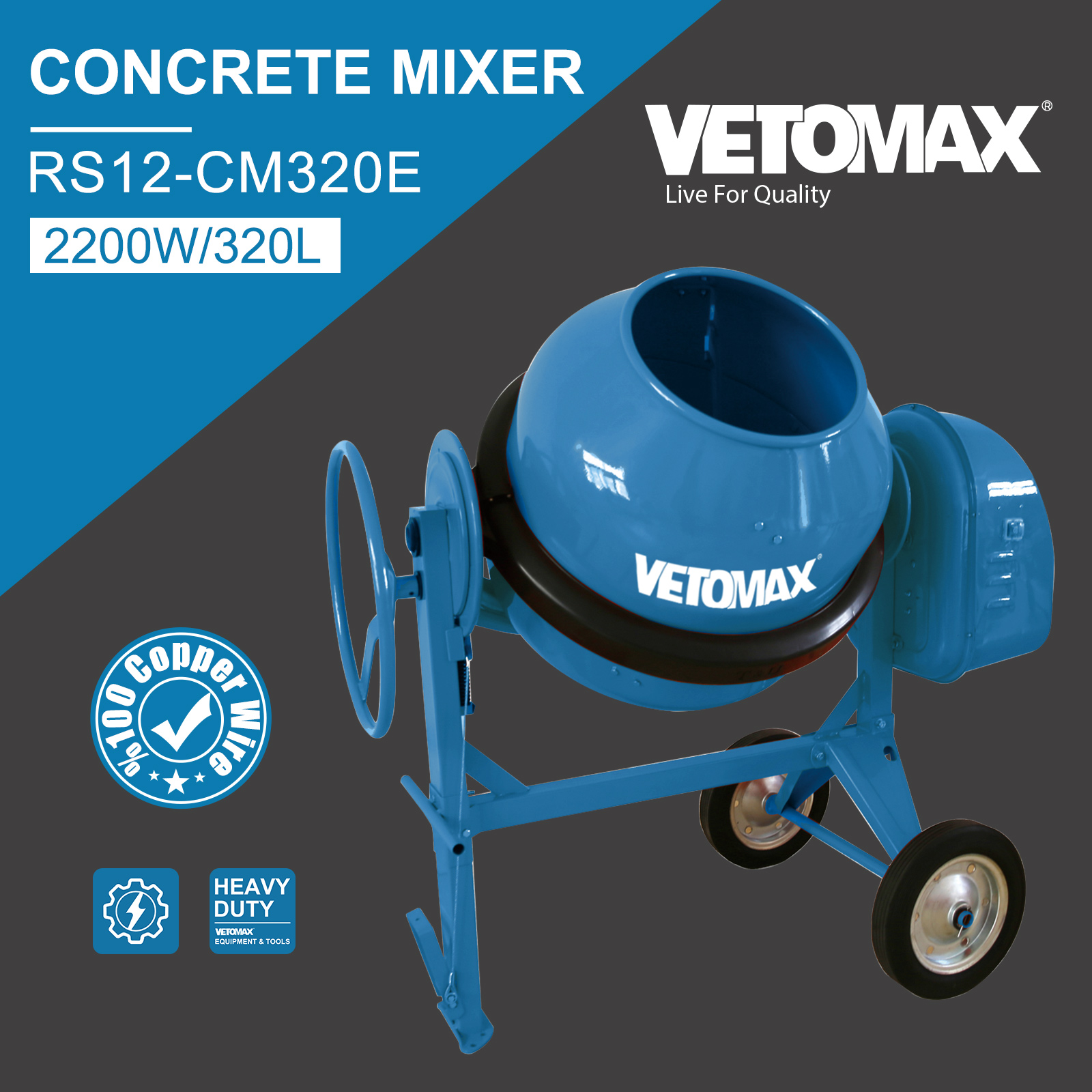 CONCRETE MIXER Voltage: 220-240V/50HZ Drum Volume: 320L Input power: 2200W Drum Diameter : 742mm Drum height : 810mm Copper wire induction motor IRON CASE DIM:158*83*150CM