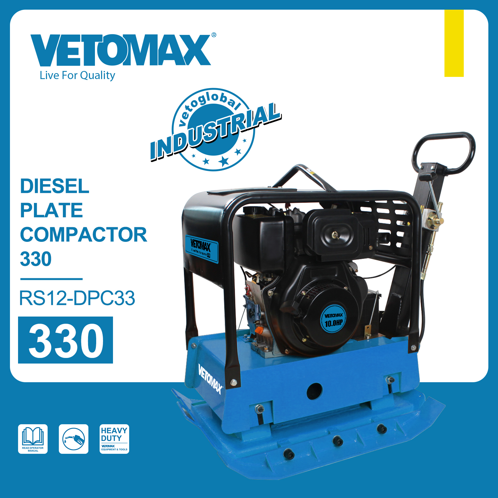 Diesel Plate Compactor 330B Engine: Diesel 186FAE Engine power:10.0HP Weight:285Kgs Frequency:4000VPM Centrifugal force:50kN Compaction depth:50cm Travel speed:25cm/s Efficiency:405M2/Hr Plate size:87.3.2x47.5cm Starting system: ELECTRIC Packed by carton box
