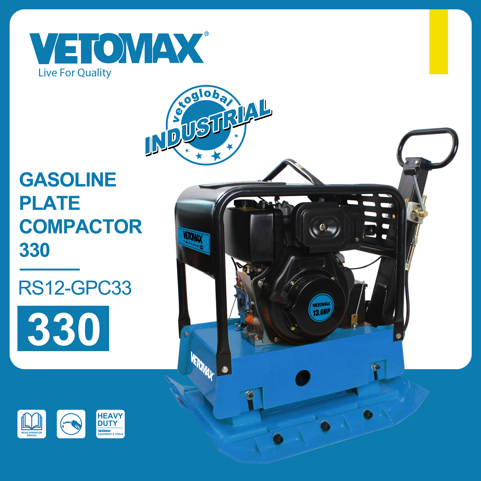 Gasoline Plate Compactor 330B Engine: VETOMAX model VG390 Engine power:13.0HP Weight:285Kgs Frequency:4000VPM Centrifugal force:50kN Compaction depth:50cm Travel speed:25cm/s Efficiency:405M2/Hr Plate size:87.3.2x47.5cm Starting system: MANUAL Packed by carton box