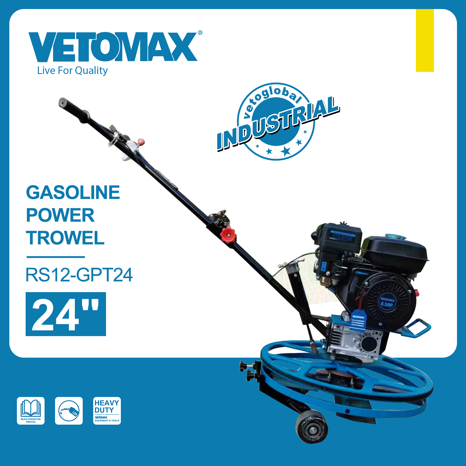 0.6M Gasoline Power Trowel Engine:VETOMAX VG200 Engine power:6.5HP Weight:60Kgs Rotor diameter:60cm(24") Finish blade:22x13cm(5×8″) Blade number: 4 pieces Starting system: Recoil Packed by carton box With Wheels