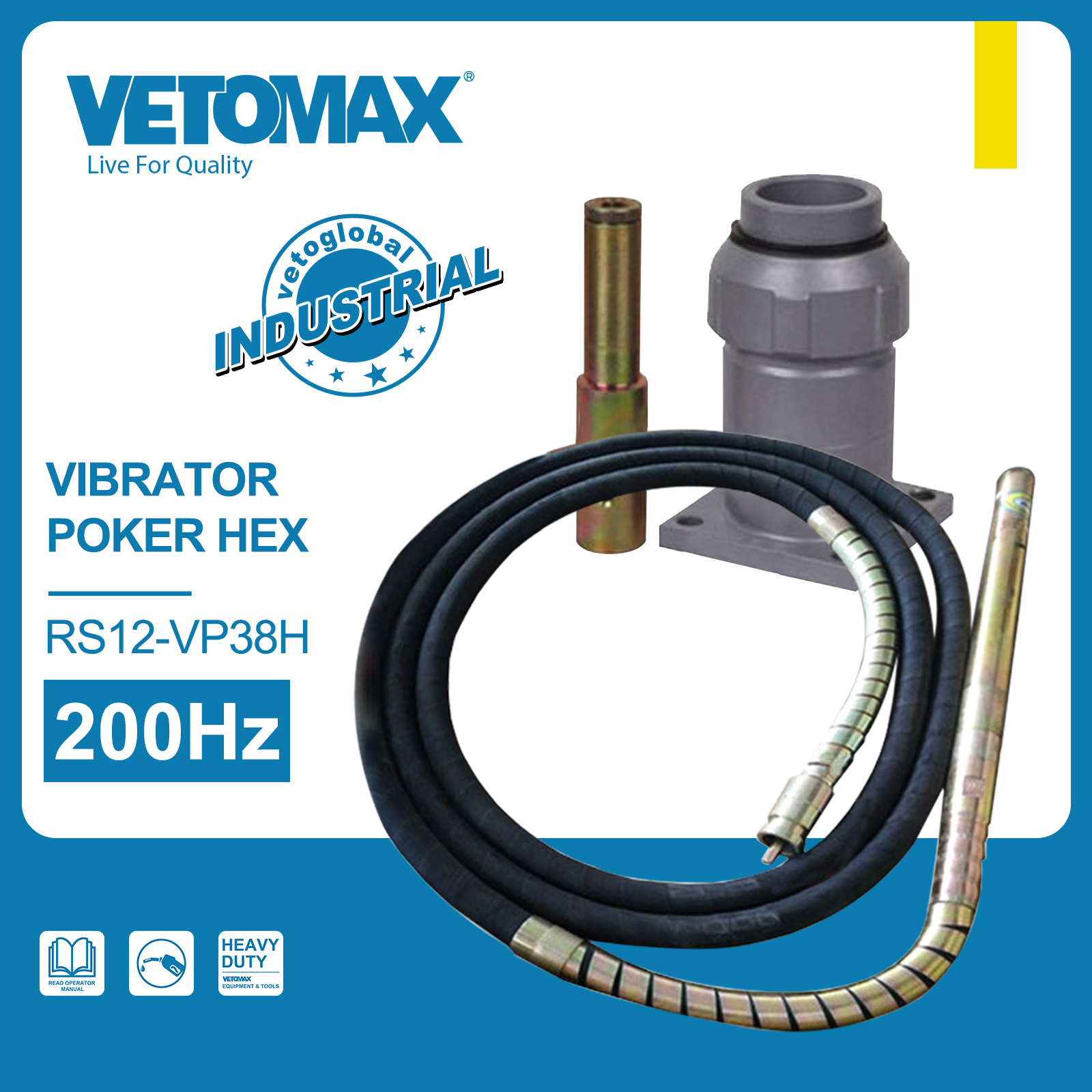VIBRATOR POKER HEX HEX type fitting DIAMETER: 38mm Head length:470mm Vibrating frequency:200Hz Vibrating ampitude:1.2m/min Flexible hose length:6m Packing: carton box