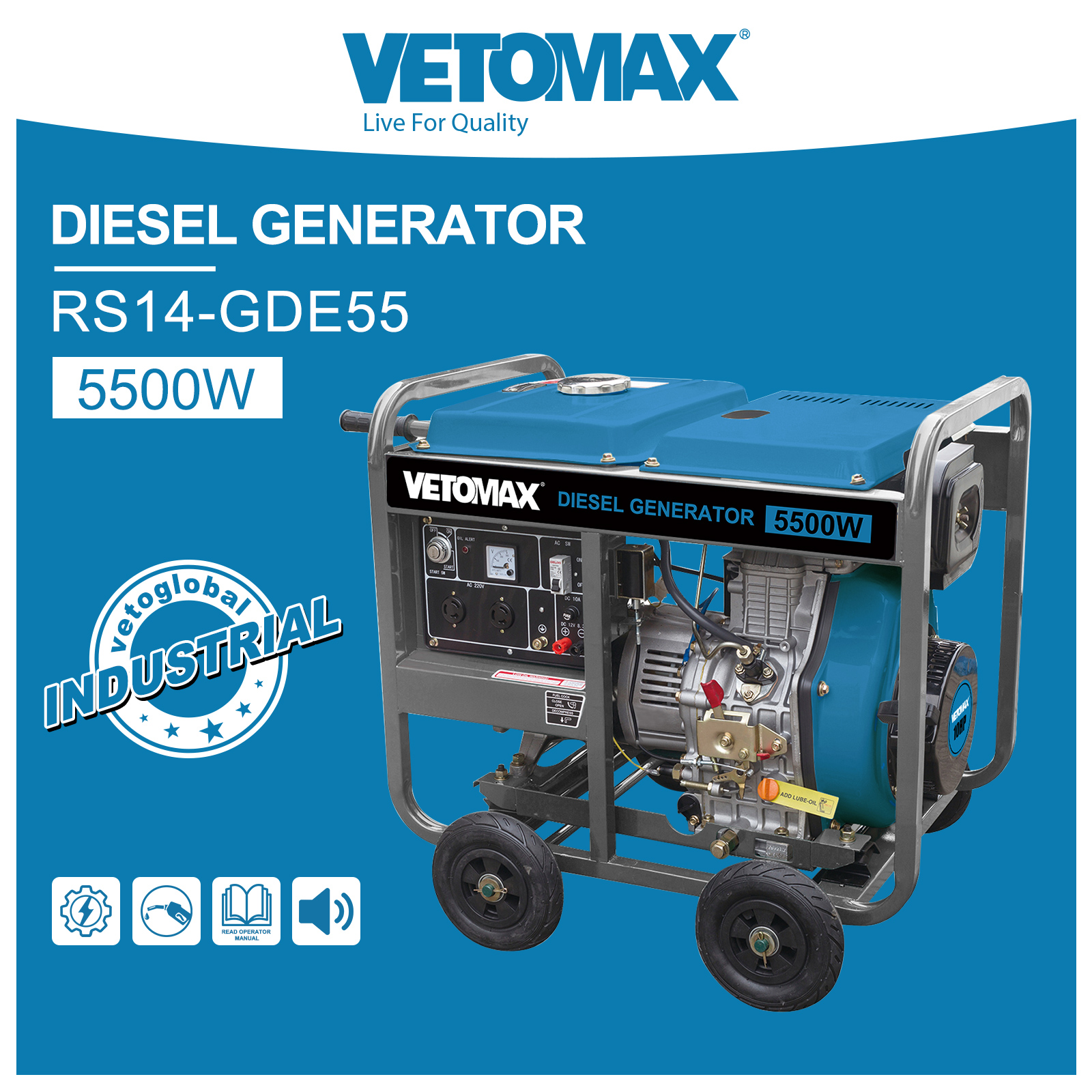 5KW DIESEL GENERATOR Rated voltage (V) : 220-240V Rated frequency (Hz) : 50Hz Phase: Single Max output (kW) : 5.5KW Rated output (kW) :5.0KW Rated speed (rpm) : 3000 Engine: Diesel 10HP Displacement (cc) : 418 Cooling system: Air-cooled Starting system: Electric Copper coil alternator Fuel tank (L) : 12.5 With 1 set auxiliary handle and wheels Packed by carton box