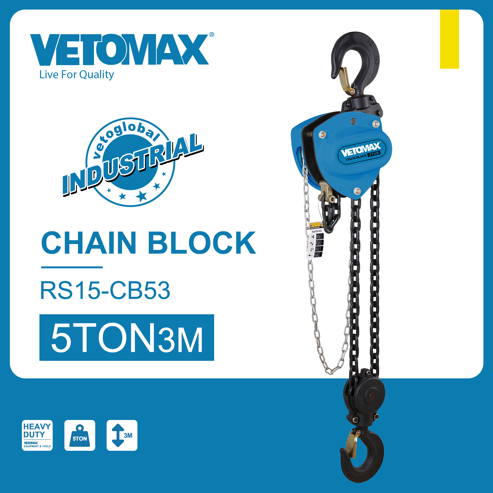 CHAIN BLOCK Capacity: 5TON double falls Lifting Height :3m Load Chain: 10mm Wood box packing DIM: 42*33.5*25CM