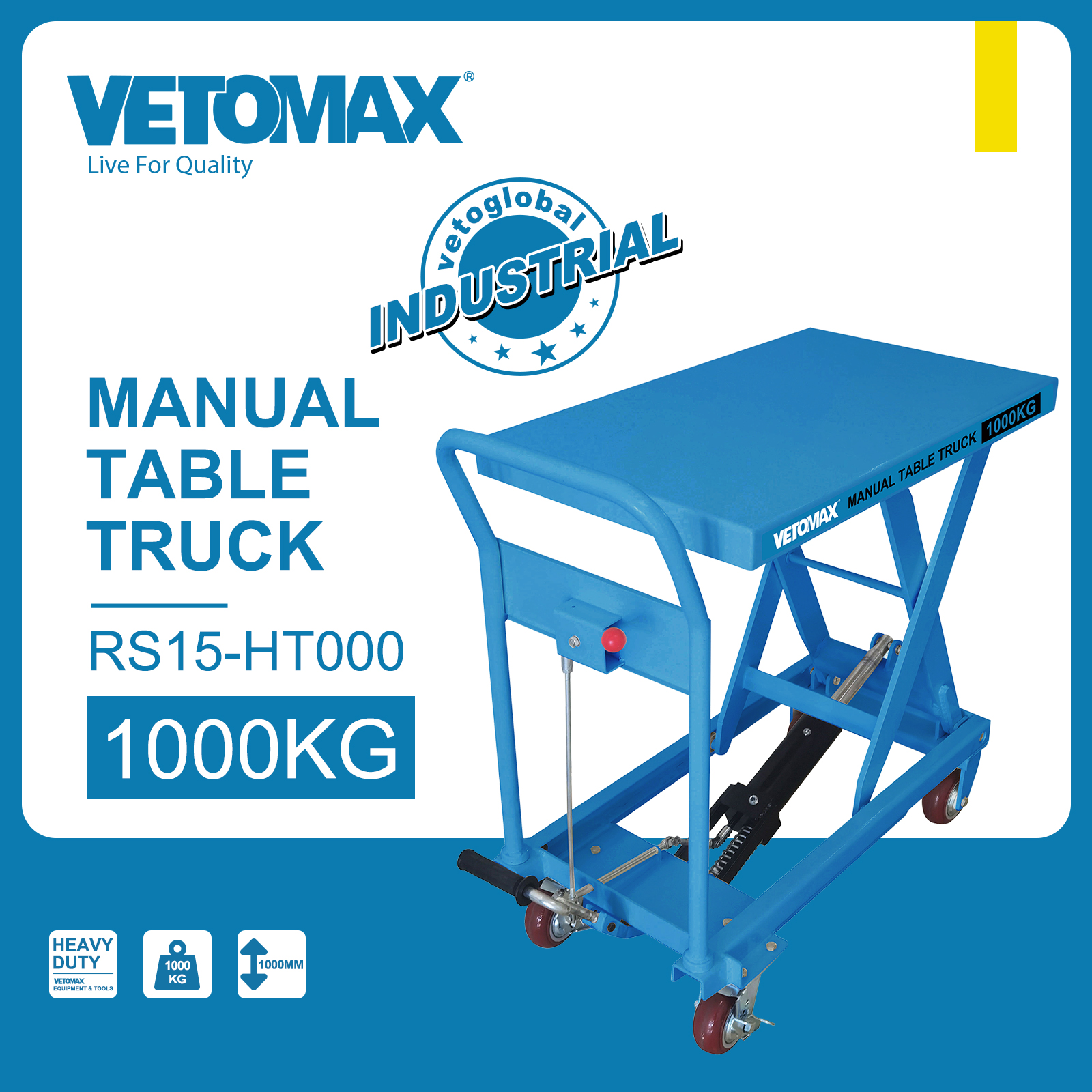 MANUAL TABLE TRUCK Capacity:1000 Min Height(H1/mm):410 Max Height(H2/mm):1000 Table Size(mm):1000*500*55 Tendam Wheel(mm):150*50 DIM: 105x55x49CM
