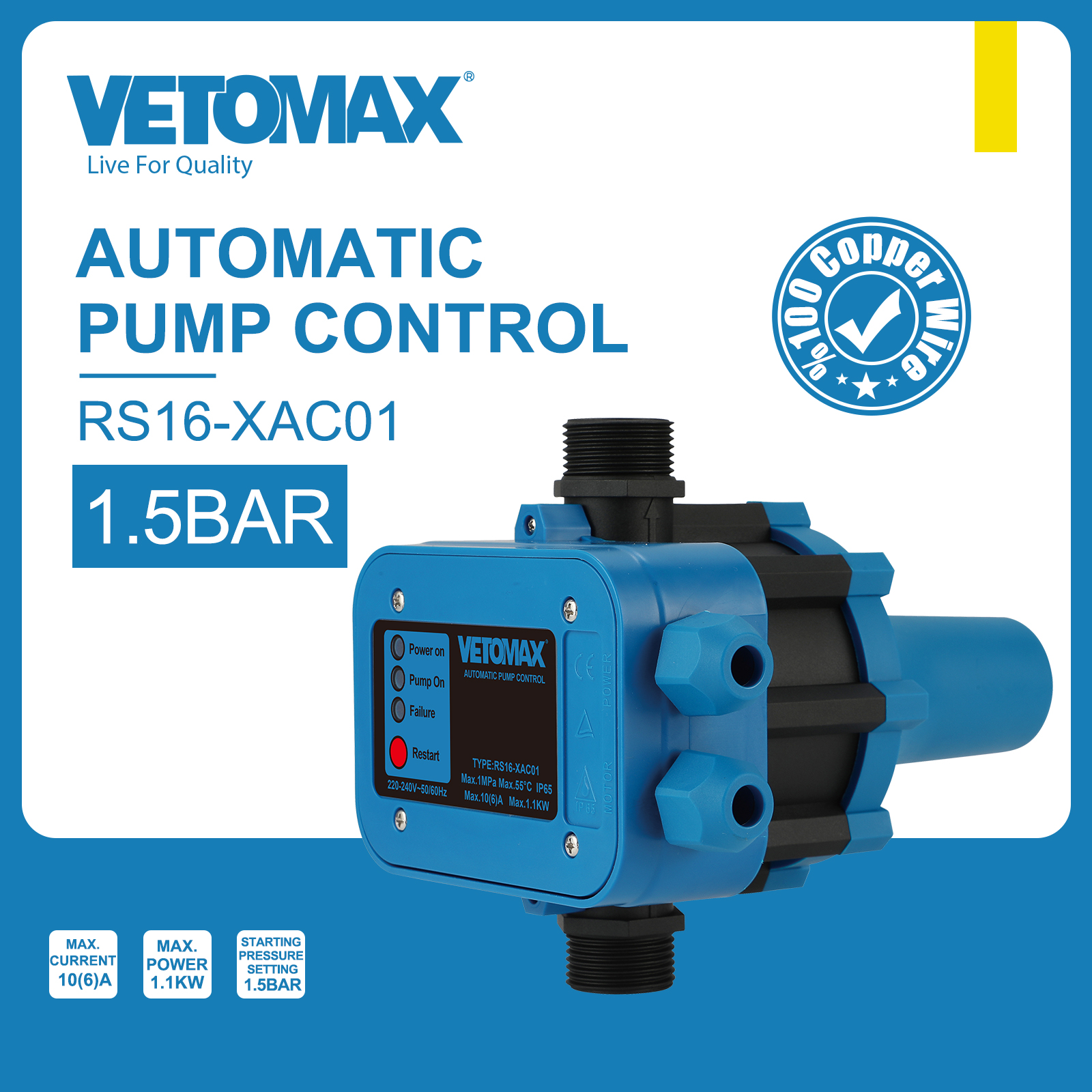 Automatic pump control Rated voltage: 220V-240V Frequency: 50HZ/60HZ Max.current: 10(6)A Max.power: 1.1KW Starting pressure setting: 1.5bar Connection thread: G1'' Protection rating: IP65 Max.working temperature: 55℃ with two 30cm cable (H05RN 3X0.75mm2)