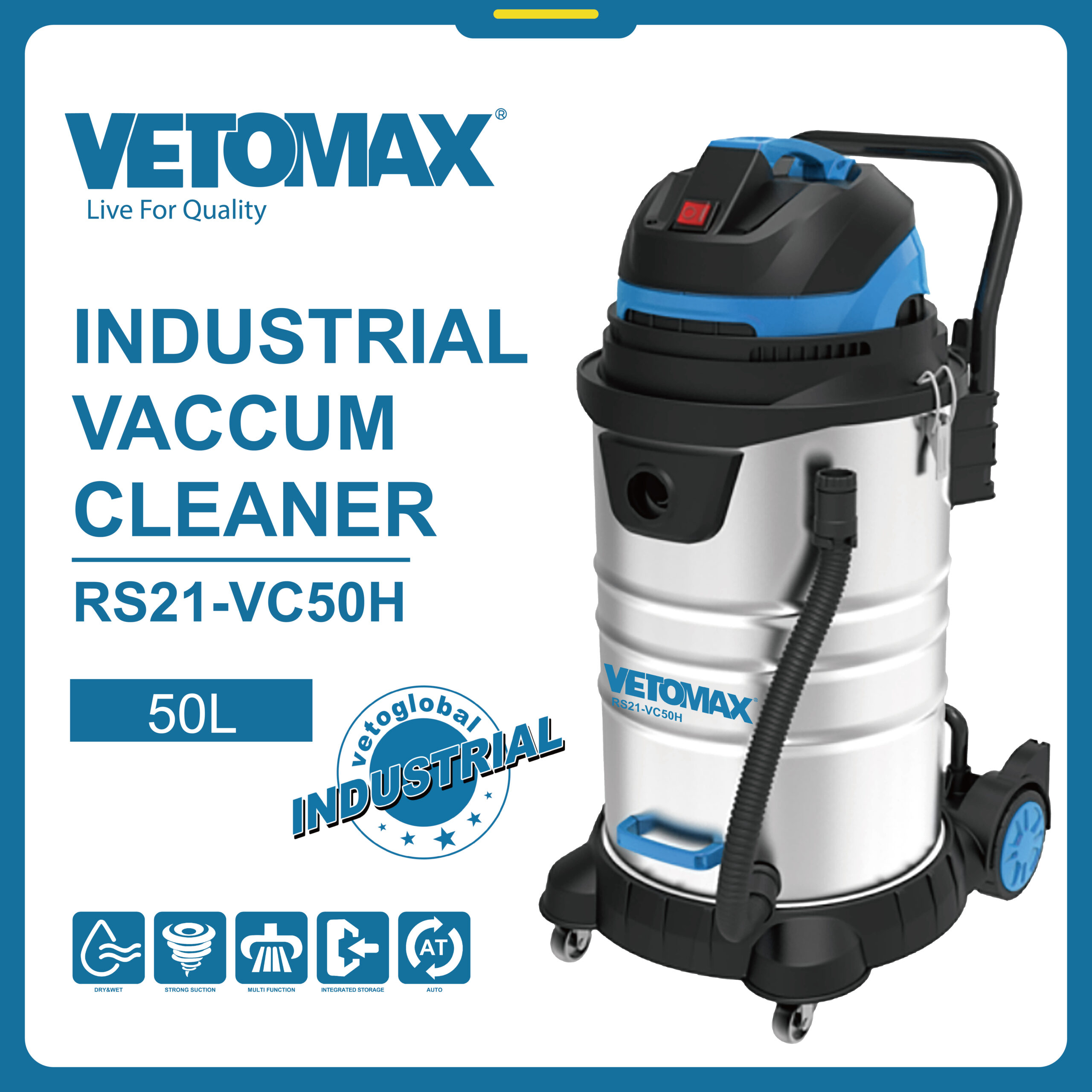 INDUSTRIAL VACCUM CLEANER VOLTAGE: 220V-50/60hz CAPACITY: 50L POWER: 1200W VACUITY: ≥21KPA NOISE:≤78DB1). High efficient dust shaking 2). On/off blowing function 3). Lock/unlock hose connection 4). Accessories storage function 5). Cable storage function colour box