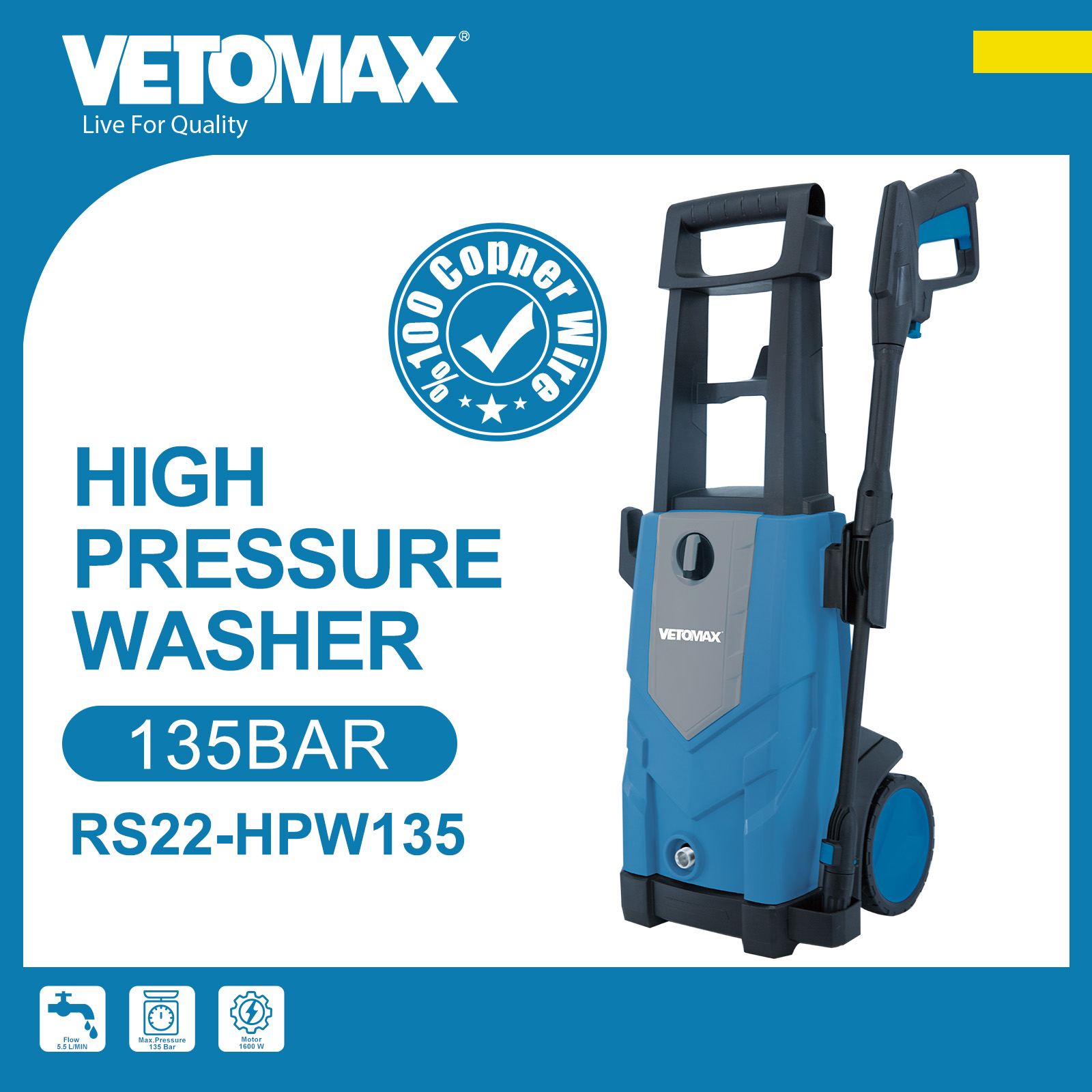 HIGH PRESSURE WASHER *VOLTAGES : 220-240V/50HZ *Auto stop *Carbon Brush copper motor *COPPER WIRE *Motor size (W) : 1600W *Max Pressure(Bar): 135 *Rated Pressure (Bar) : 90 *FLOW : 5.5L/MIN colour box