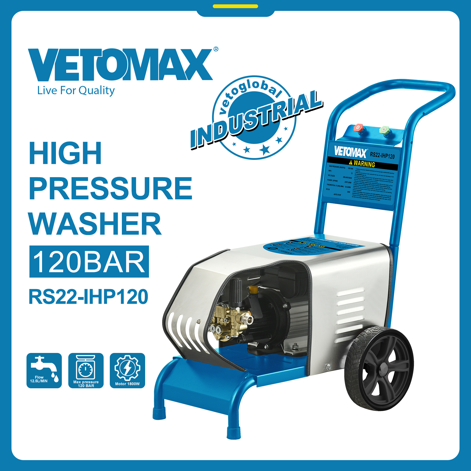 HIGH PRESSURE WASHER *MAX PRESSURE (BAR/PSI):120/1600 MPA:12 *VOLTAGES : 220-240V/50HZ *POWER (HP/KW) : 2HP/1.8KW *THEORETICAL *THEORETICAL FLOW(L/MIN) : 12.5L/MIN *R.P.M : 2800 *Auto stop Carton Packing