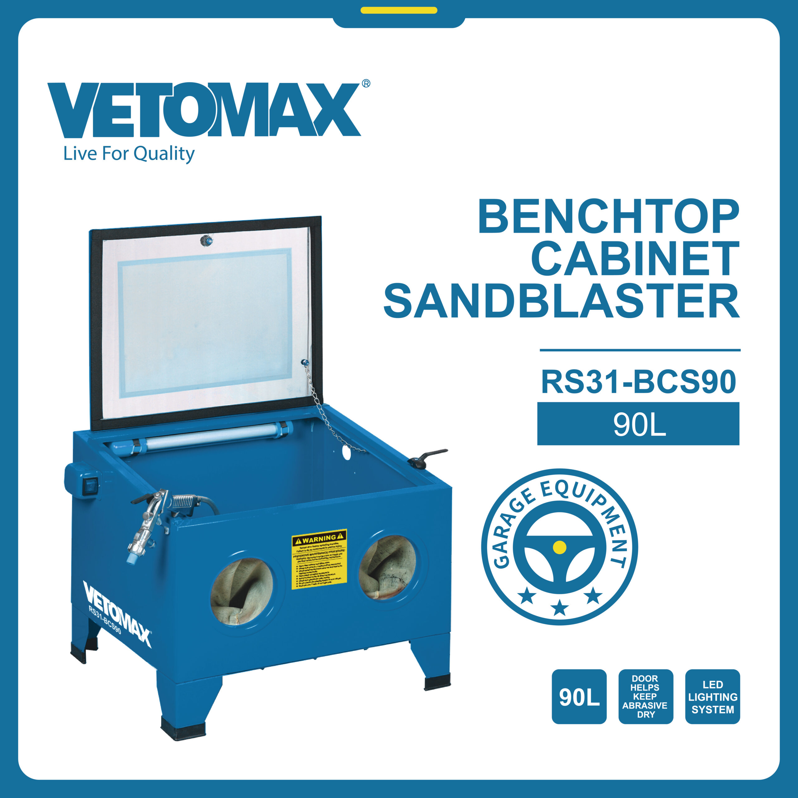 BENCHTOP CABINET SANDBLASTER Air compressor delivery of 40-80PSI @ 5CFM. Working pressure: 60-115PSI Overall dimension:585X480X490mm Maximum sand loading capacity:6.5L Nozzle Size:4/5/6/7mm Air hose: φ6*710mm Sand hose: φ13*680mm Working space:585X458X305mm Carton packing
