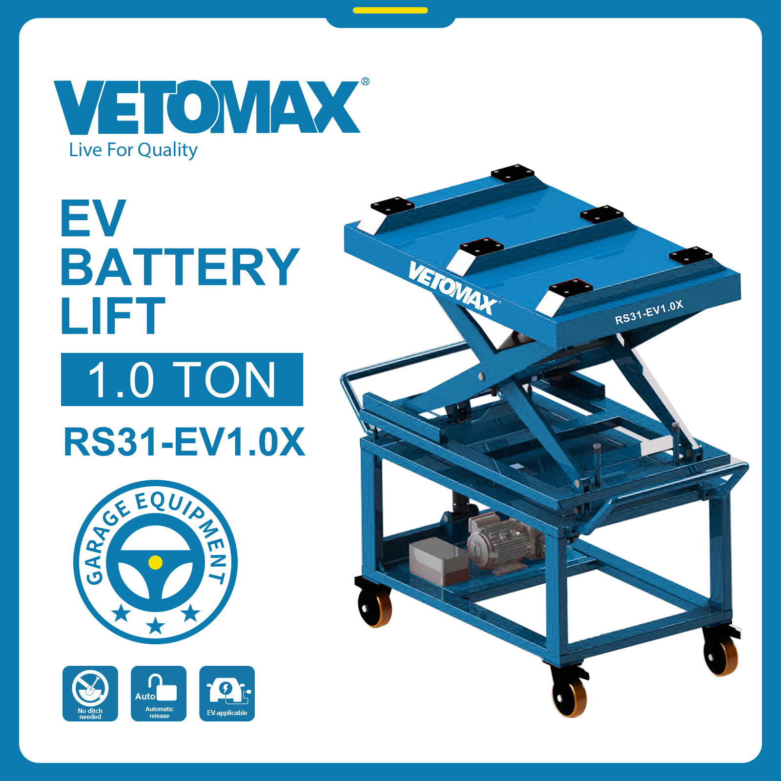 EV BATTERY LIFT *CAPACITY : 1.0TON *POWER SUPPLY : 220V -50HZ *MOTOR : 1.1KW *LIFTING HEIGHT : 1800MM *MIN HEIGHT : 1130MM *PLATFORM LENGTH :1246MM *PLATFORM WIDTH : 800MMN.W:340 KGS G.W:370 KGS DIM: 130*85*114.5 CM