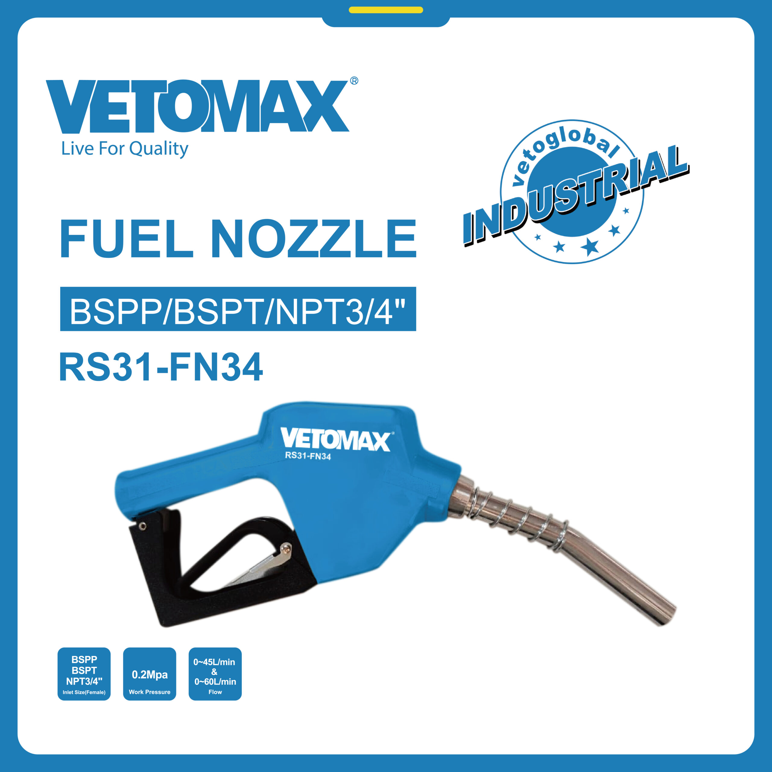FUEL NOZZLE Inlet Size(Female): BSPP/BSPT/NPT3/4" Outlet :13/16" or 15/16” Flow: 0~45L/min & 0~60L/min Work Pressure: 0.2Mpa Weight:1.1Kgs carton box