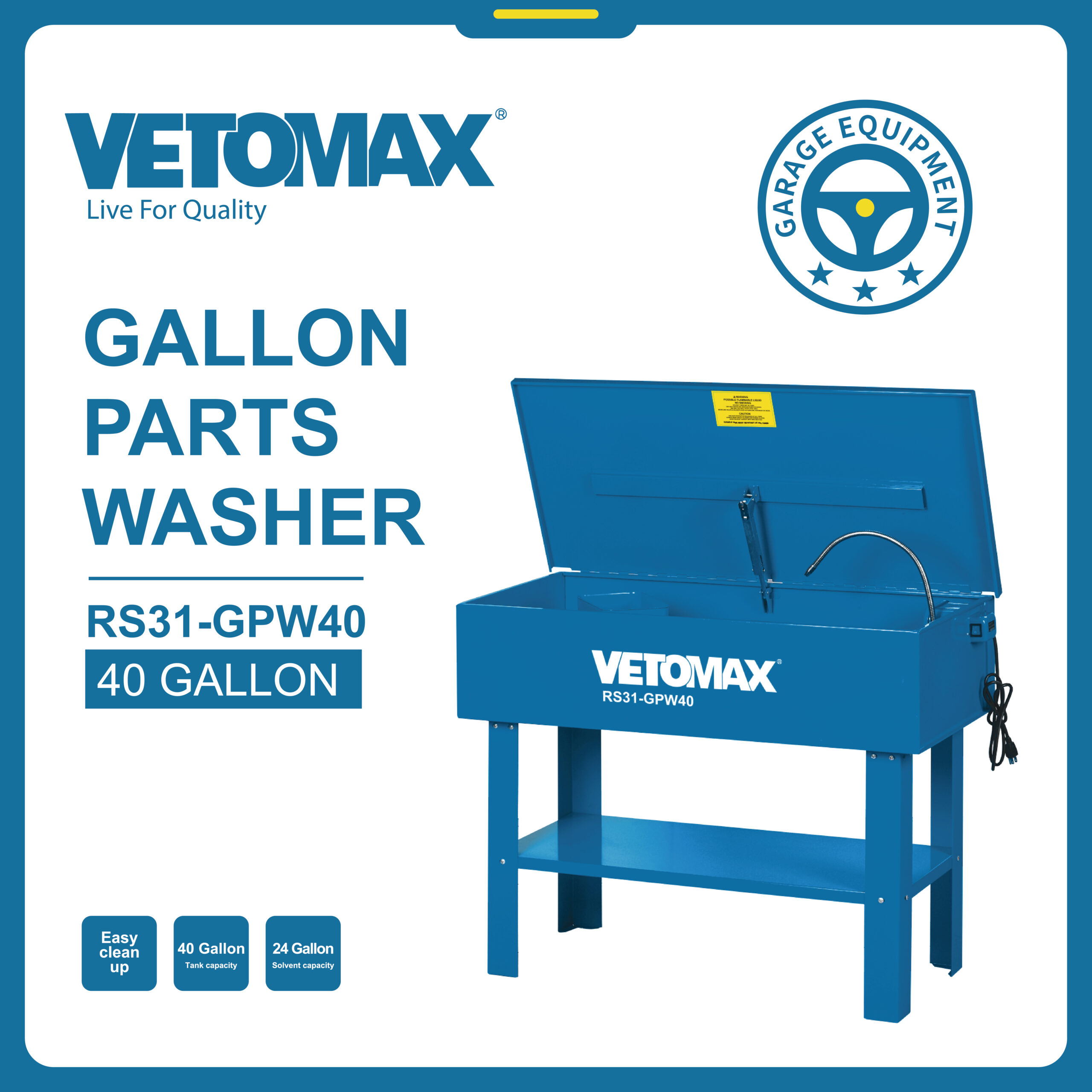 GALLON PARTS WASHER 40 gallon capacity Max Pump output through spigot: 2.7-3.3Liter/Min Electric requirement: 220V-240V,50Hz Max Head: 2.2 m Solvent capacity: 24 Gallon Overall size: 113x54x89cm Carton packing