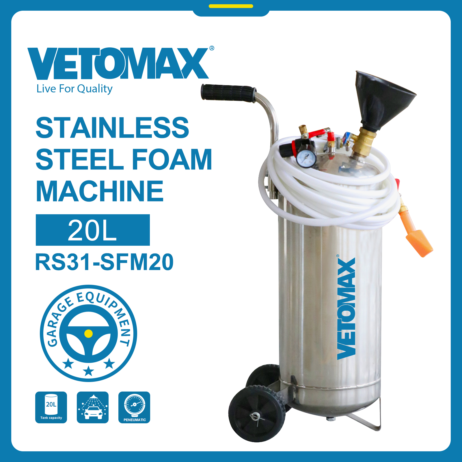 STAINLESS STEEL FOAM MACHINE *WORKING AIR PRESSURE : 1-3BAR *TANK VOLUME : 20L *MATERIAL : STAINLESS STELL:#201 *TANK THICKNESS : 1.2MM *MAX SAFETY VALVE PRESSURE : 3BAR *WHEEL 2*5" FIXED WHEEL
