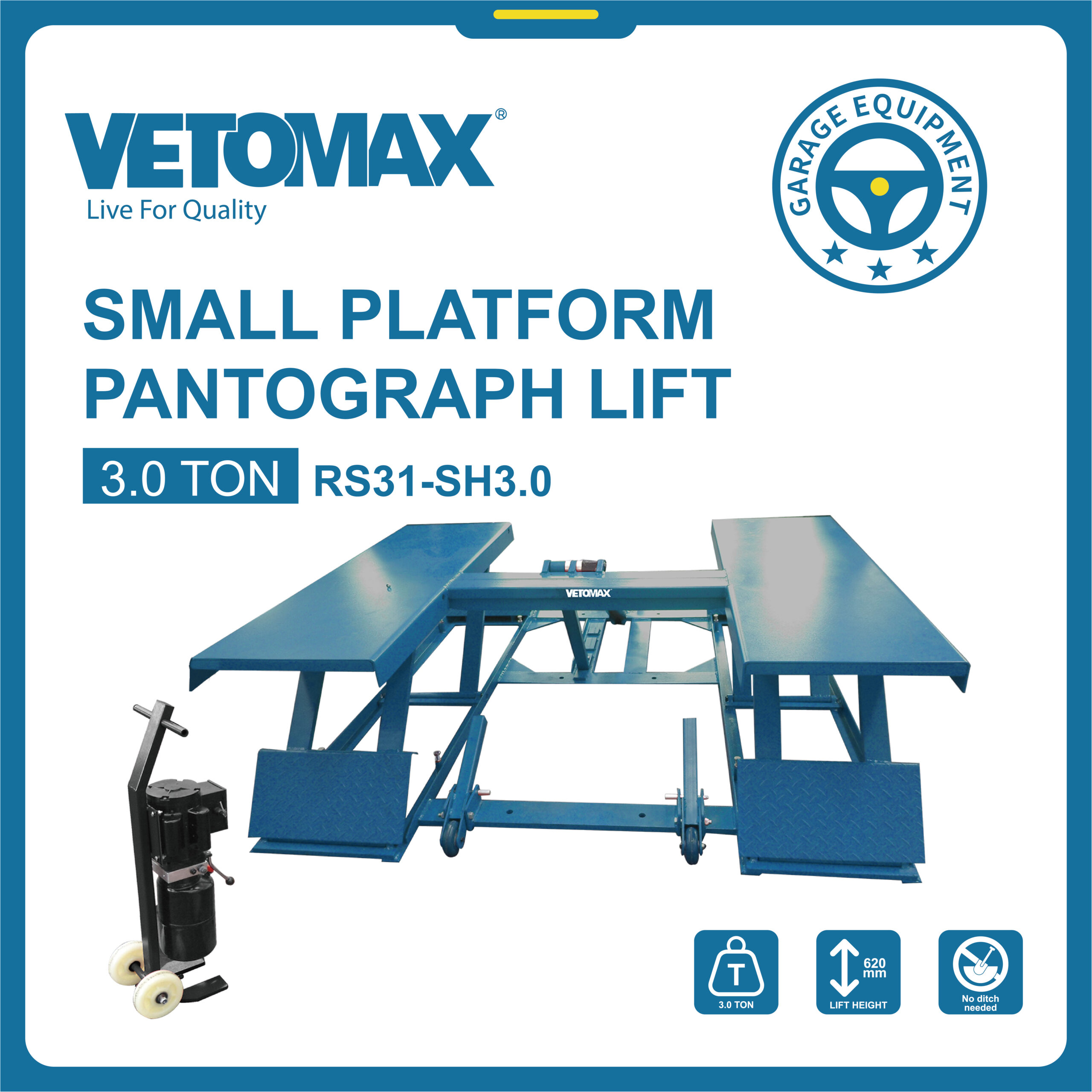 SMALL PLATFORM PANTOGRAPH LIFT *CAPACITY : 3.0TON *POWER SUPPLY : 220V -50HZ *MOTOR : 2.2KW *LIFTING HEIGHT : 620MM *MIN HEIGHT : 100MM *PLATFORM LENGTH :1400MM *PLATFORM LENGTH :1400MM *NO DITCH NEEDED N.W:419.5 KGS G.W:479.5 KGS DIM: 195*204*22CM