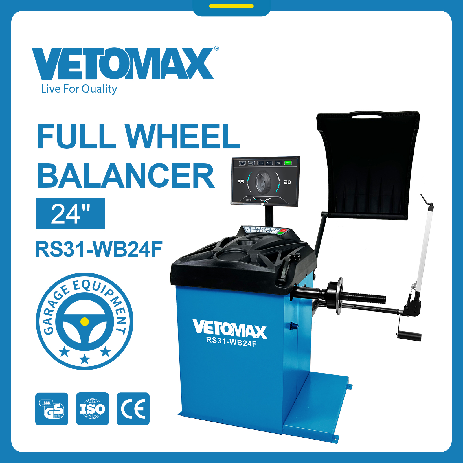 FULL WHEEL BALANCER *LCD DISPLAY SCREEN *CLAMPING CAPACITY :24" *MAX.WHEEL WEIGHT : 70KG *POWER SUPPLY :220V-50HZ *BALANCING ACCURACY:±lg *RIM DIAMETER:10"-24" *RIM WITH:3"-16" *ROTATE SPEED : 90/130rpm *MEASURING TIME : 7sec *NOISE LEVEL:<70dB *Muitiple language selection. *Electromagnetic brake.*The laser finds a point. The laser can indicate exactly where paste. N.W:100 KGS G.W:124 KGS DIM:96*76*125CM