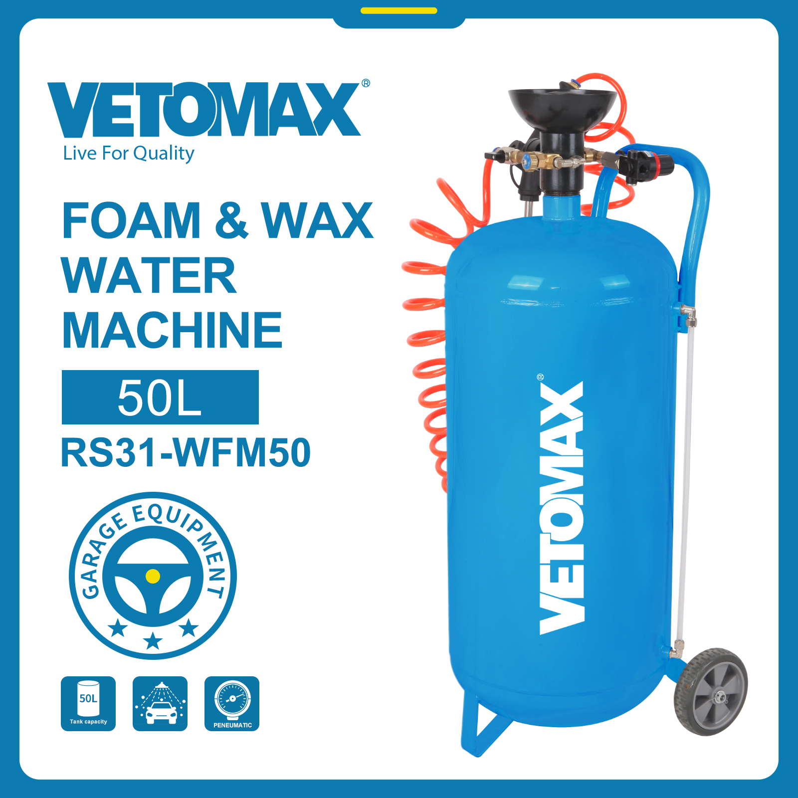 FOAM & WAX WATER MACHINE *WORKING AIR PRESSURE : 5-6BAR *CAPACITY:50L *MATERIAL:IRON *TANK THICKNESS: 2.0MM *ACCESSORIES: long foam lance,9m spring hose