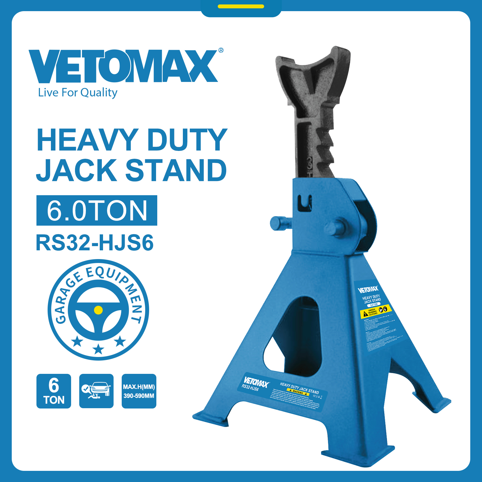 HEAVY DUTY JACK STAND 6 TON WITH FOOT PAD WITH COLOR BOX 390-590mm 14.3kg/set N.W: 28 KGS G.W: 29.3 KGS MEAS:62.5*26.5*47.5CM Packing:Colour box+Craft paper box