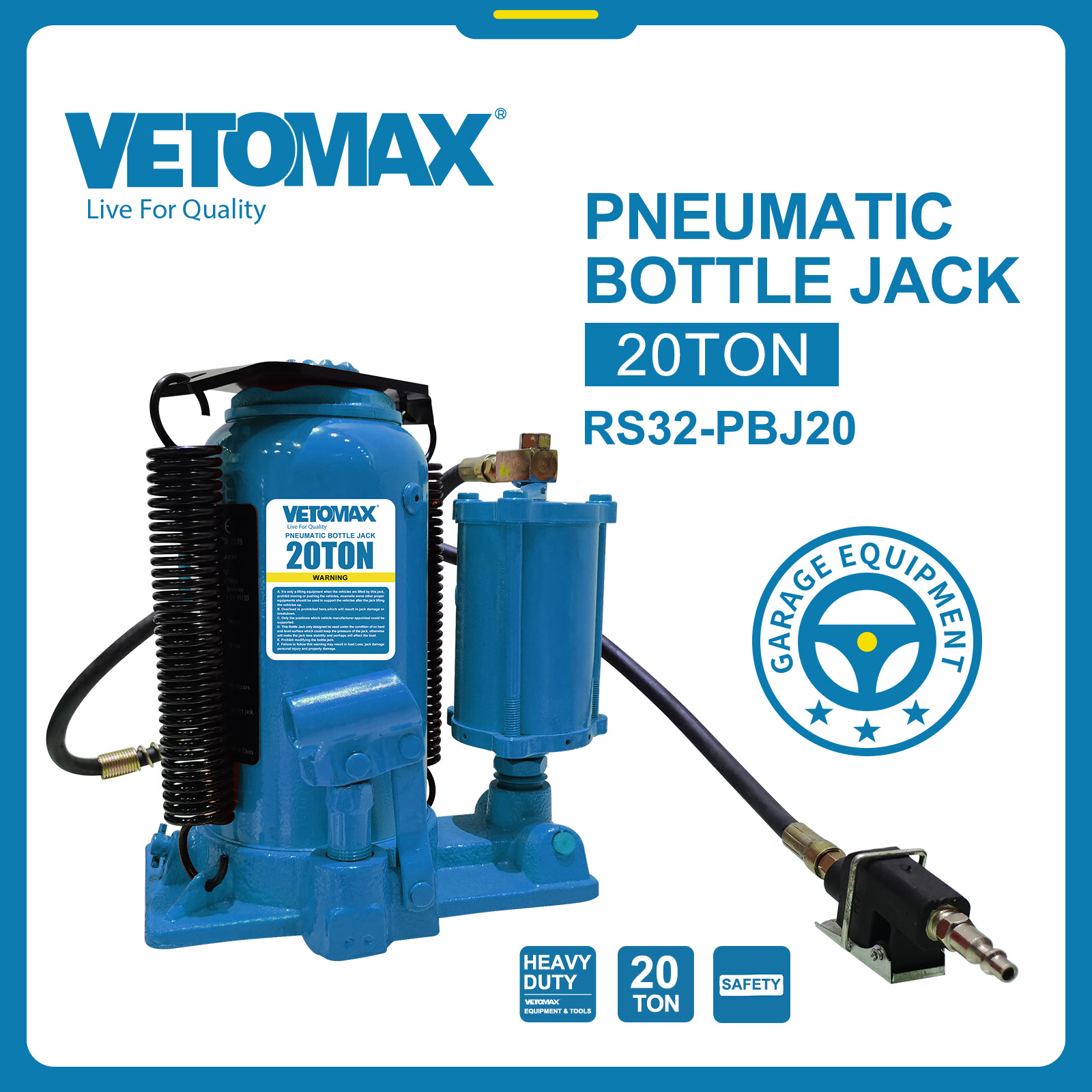 PNEUMATIC BOTTLE JACK CAPACITY(TON):20 MIN.H.(MM):260-510 LIFTING.H(MM):170 ADJUST.H(MM):80 N.W:14.5 KGS G.W:15.2 KGS MEAS:28*20*28 CM carton packing