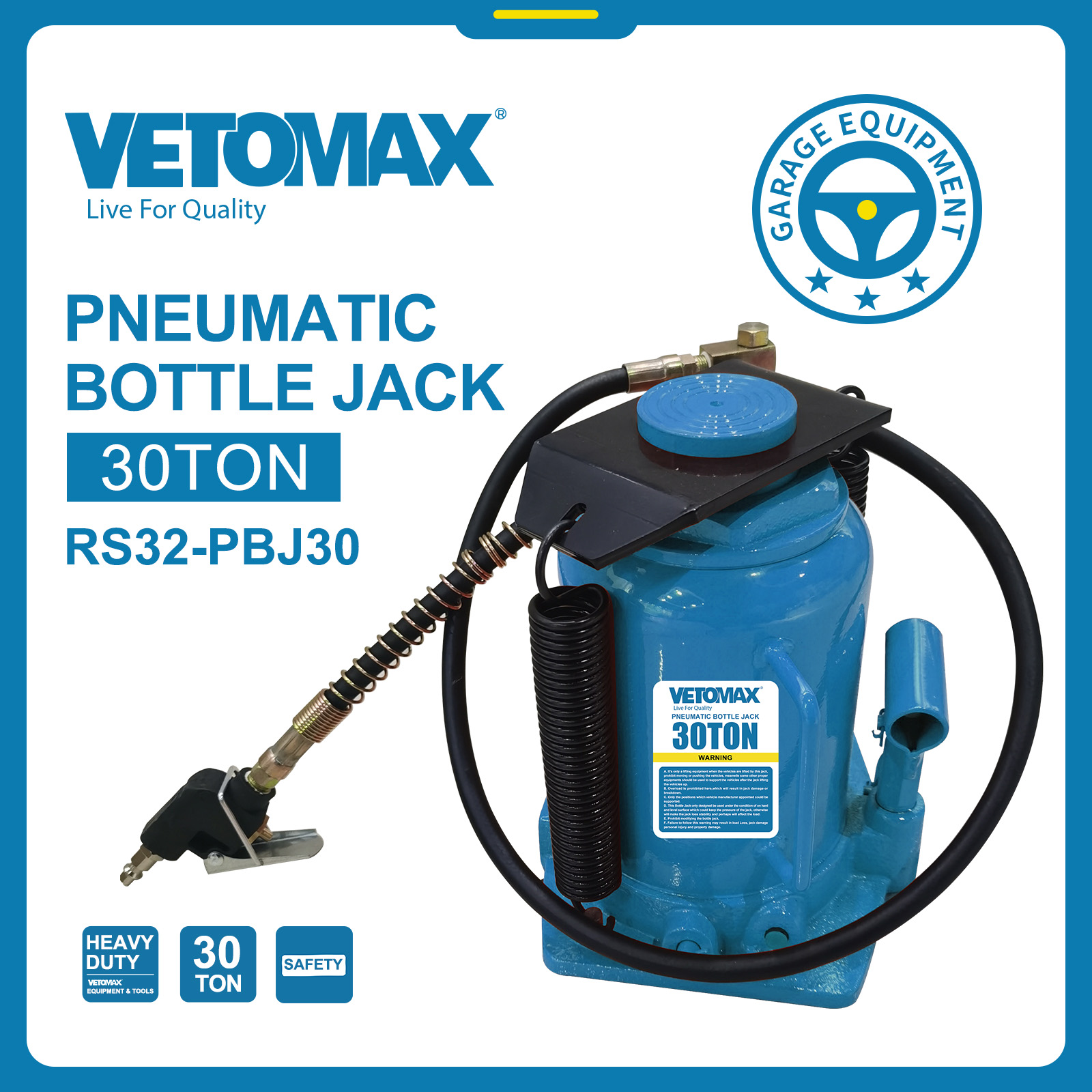PNEUMATIC BOTTLE JACK CAPACITY(TON):30 MIN.H.(MM):250-400 LIFTING.H(MM):150 N.W:21 KGS G.W:22 KGS MEAS:29*22*27 CM carton packing