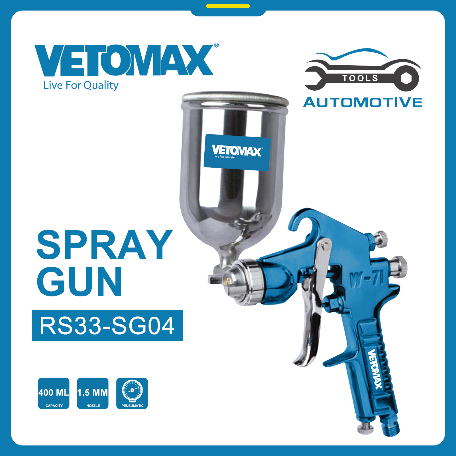 SPRAY GUN *AIR PRESSURE : 50PSI (3.5/CM) *FEED TYPE : GRAVITY *CAPACITY OF CUP : ALUMINUM 400 ML *NOZZLE SIZE : 1.5MM * COPPER NOZZLE *AIR INLET : 1/4" N.W: 12 KGS G.W: 13 KGS MEAS: 51*42*25CM colour box+carton packing
