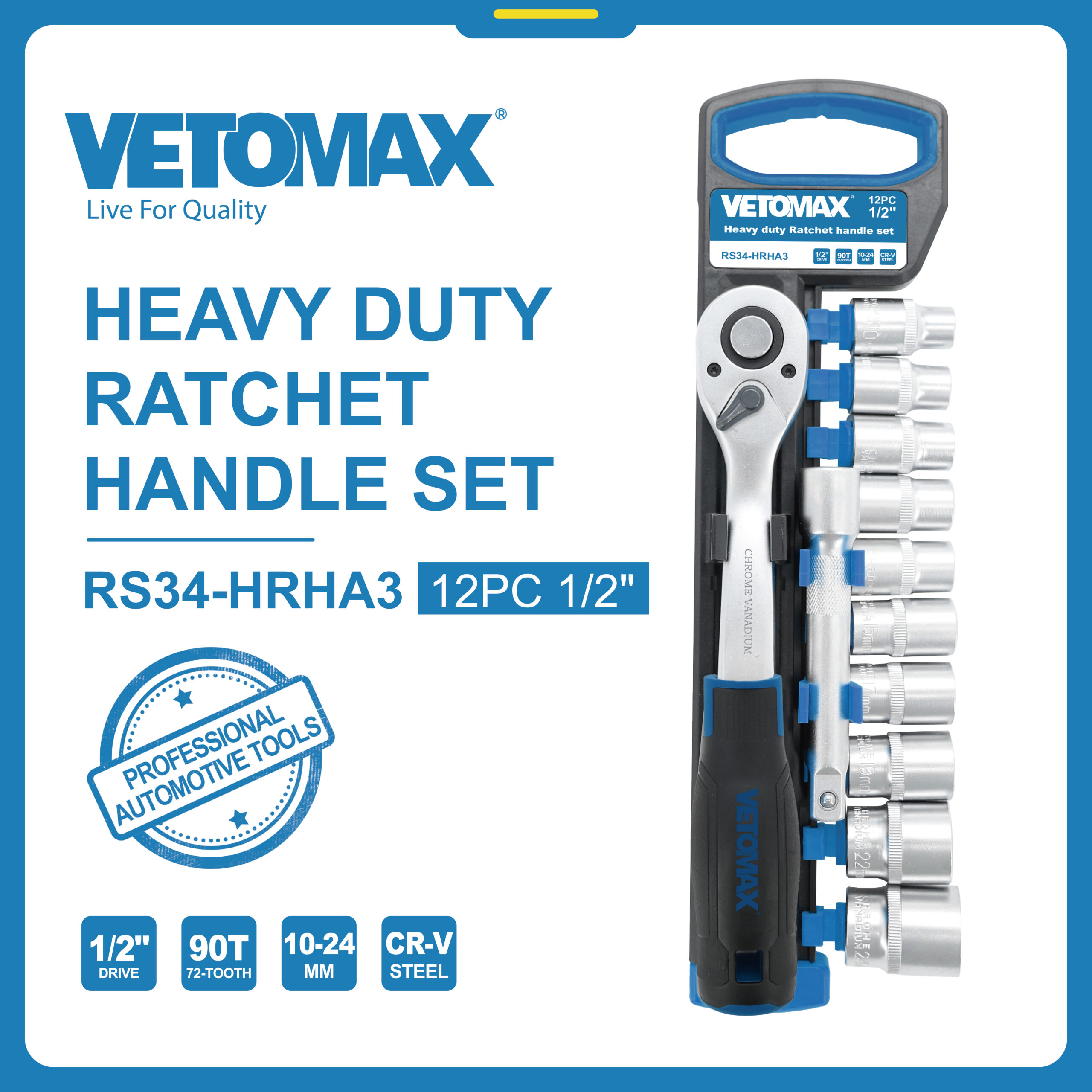 12PC 1/2"Heavy duty Ratchet handle set *1PC1/2" ratchet handle 90T *1P CRV Extension bar 125mm *socket:10 11 12 13 14 15 17 19 21 24(17/19/21 impact socket,CRMO material)