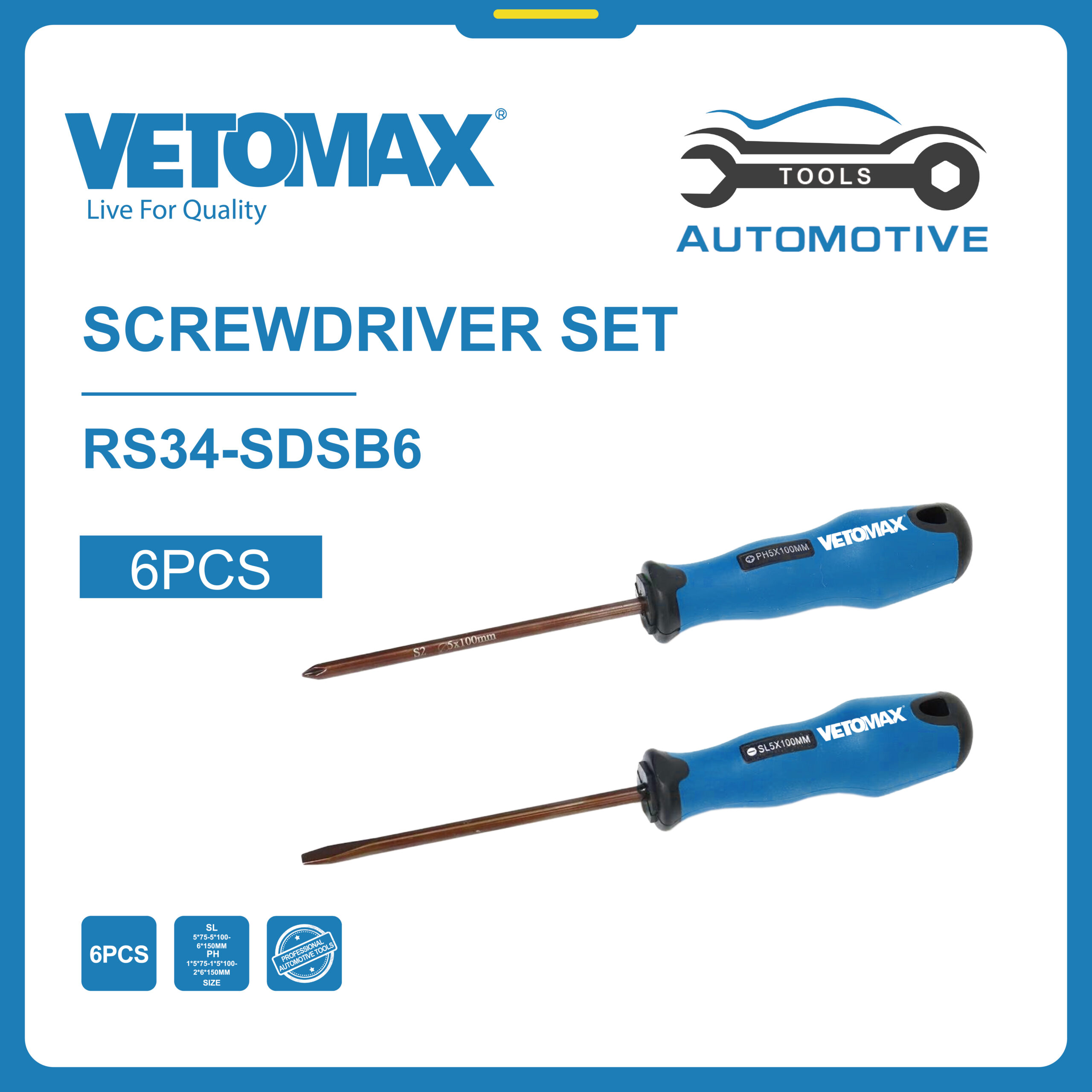 6PC SCREWDRIVER SET *SIZE : 4-SL: 5*75MM- 5*100MM-6*150MM PH 1*5*75MM -1*5*100 -2*6*150MM