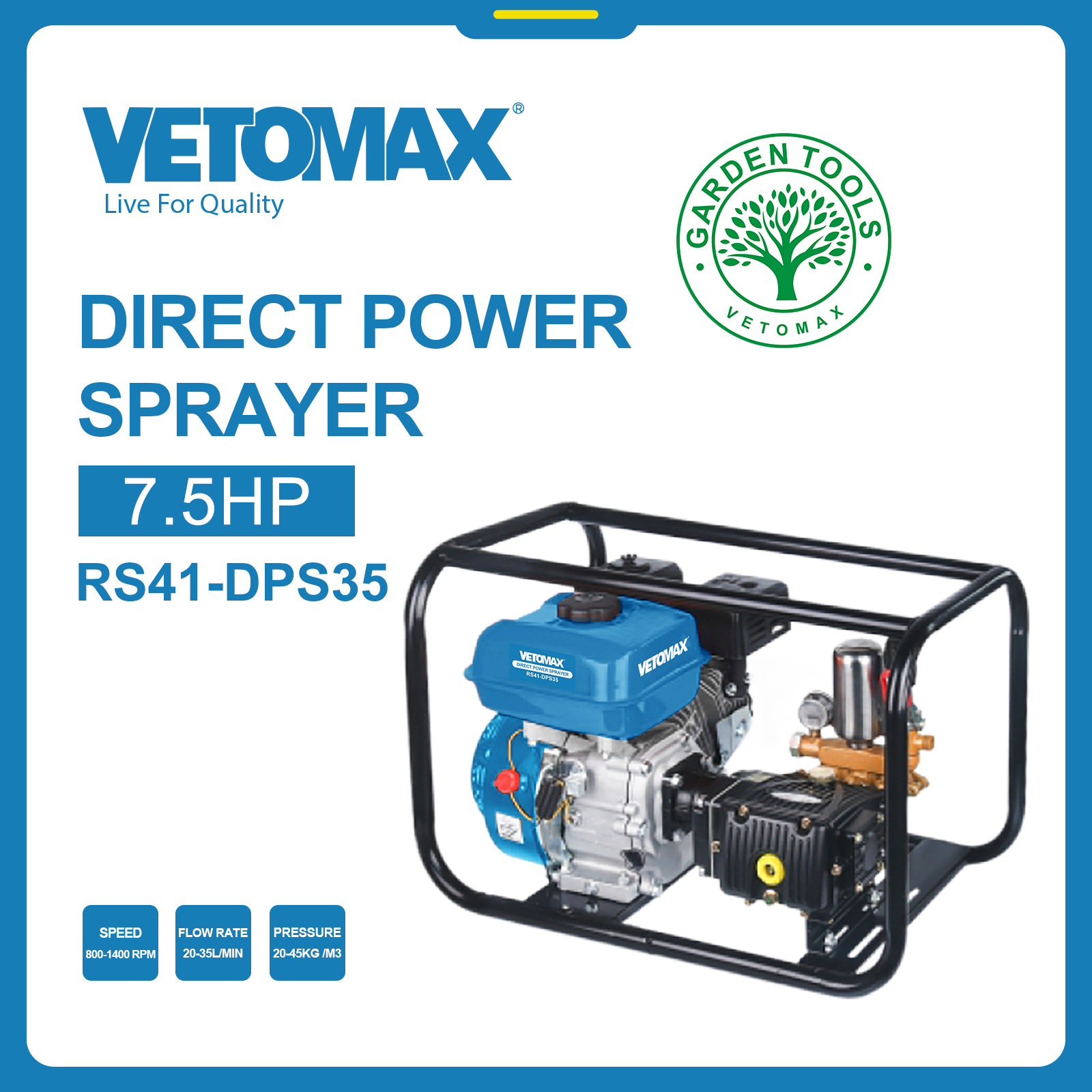 Direct Power Sprayer speed : 800-1400 rpm POWER : 7.5HP FLOW RATE : 20-35L/min PRESSURE : 20-45 /m3