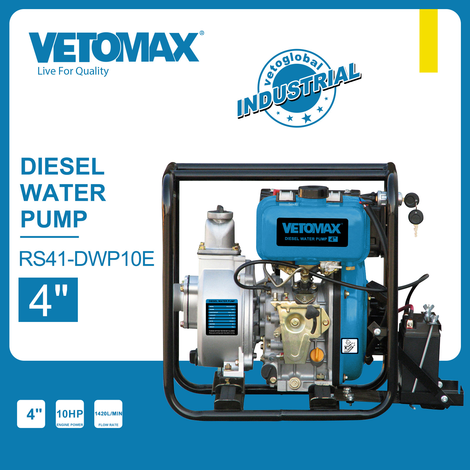DIESEL WATER PUMP SUCTION (MM) : 100mm, 4" Flow rate:1420L/min Max.head lift: 28m Max.suction head: 8 m 10HP diesel engine Fule tank: 5.5L OIL CAPACITY (L) 1.65 Starting system: ELECTRIC carton packing
