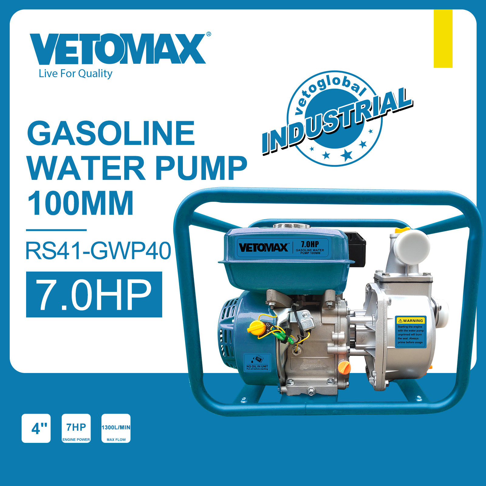 Gasoline Water Pump 100mm 4” Suction Discharge port diameter: 100mm/4" Engine power:7.0HP Max.flow: 1300L/min Max.head lift: 24m Max.suction head: 7m 7.0HP gasoline engine Displacement: 212cc Fuel tank: 6.5L Starting system: Recoil Packed by carton box